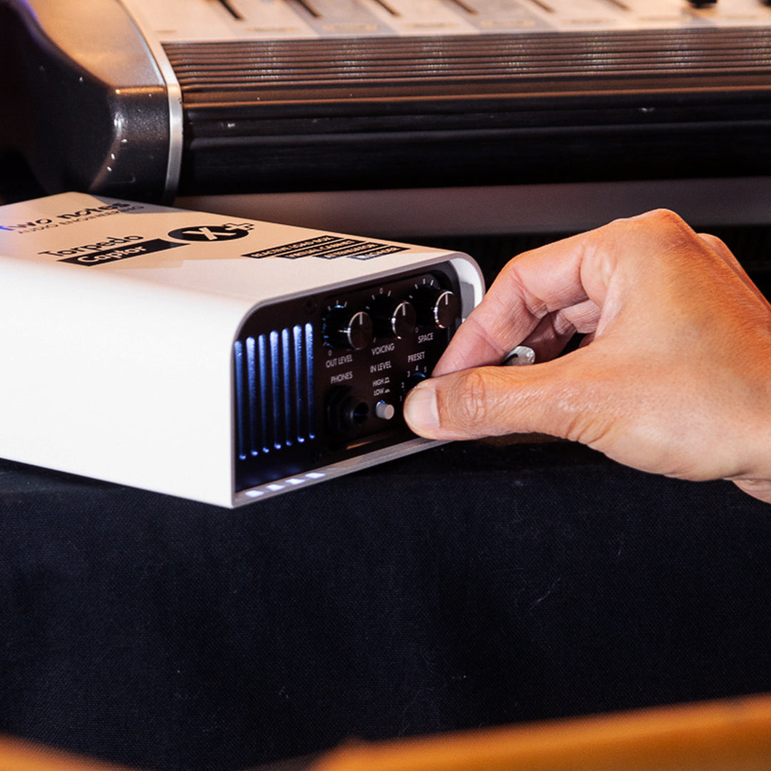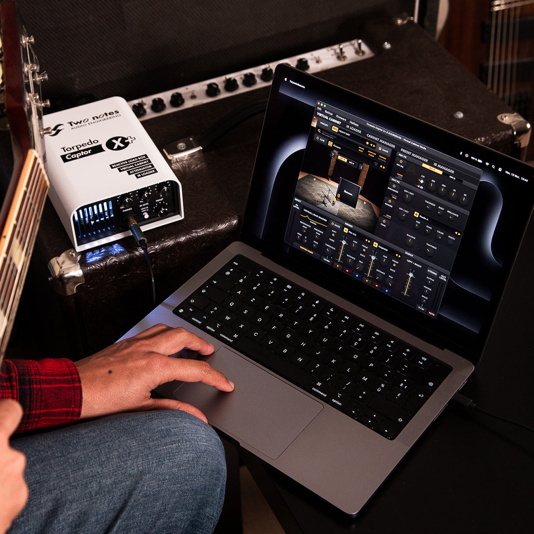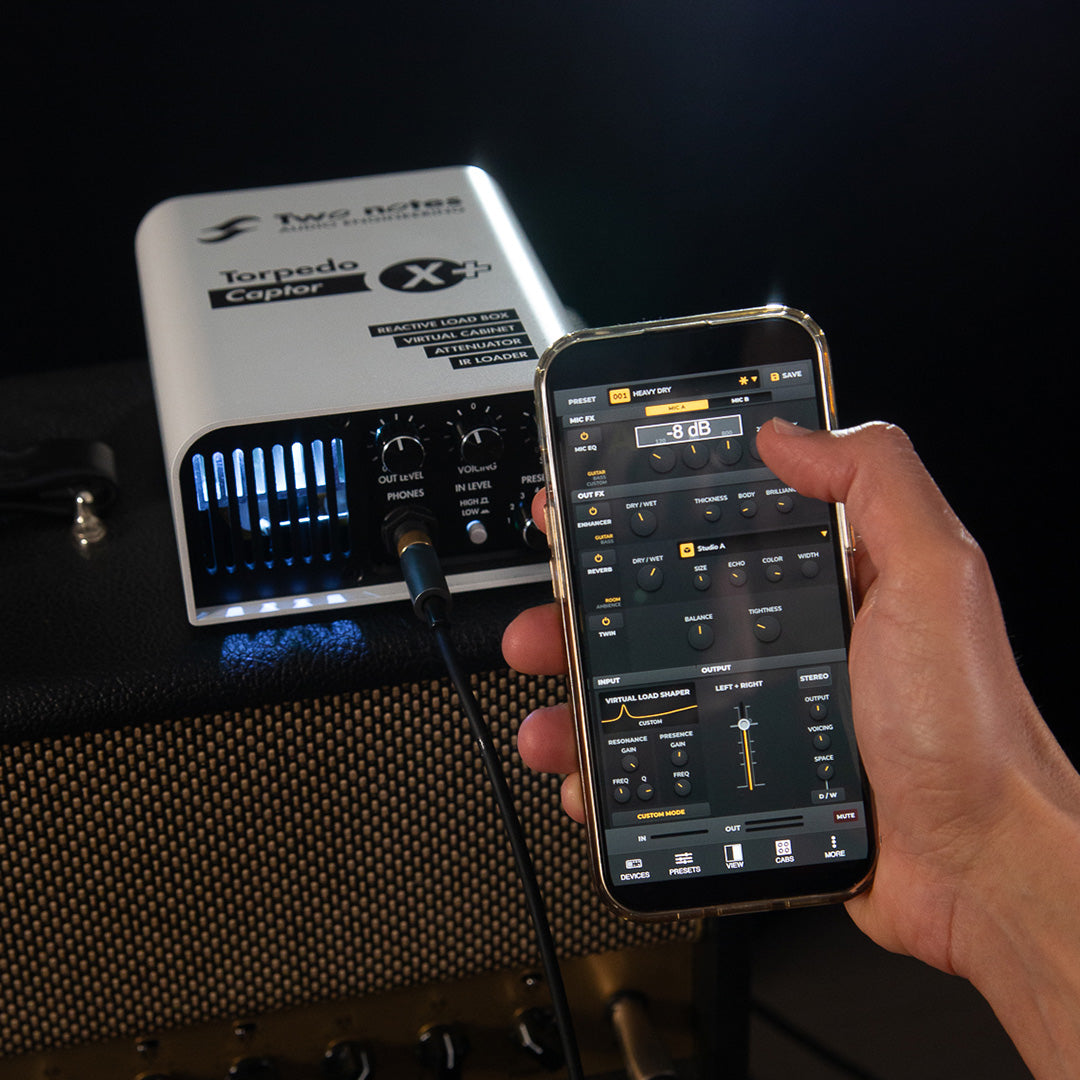 Pair Torpedo Captor X with your phone, tablet, or computer. Change the cabinet, microphones, room, EQ, reverb, or edit any parameter using Torpedo Remote.